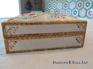 The way I look at making an embroidered casket is like baking a cake. One can have a recipe, but unless they put the ingredients together right, their cake could be amazing, or not resemble a cake at all. One can have a wooden cabinet to cover, and years of gorgeous embroidery finished... but all that will not mean a thing if they cant get the pieces mounted in a clean and orderly fashion. Tho finishing wont take near the amount of time it will take to work the embroidery, or make the cabinet, it does take a good amount of time and simply put,